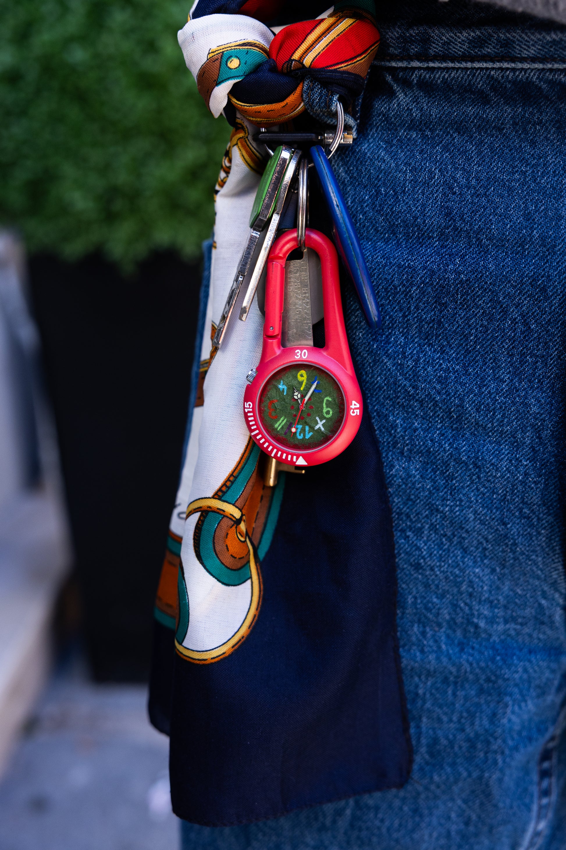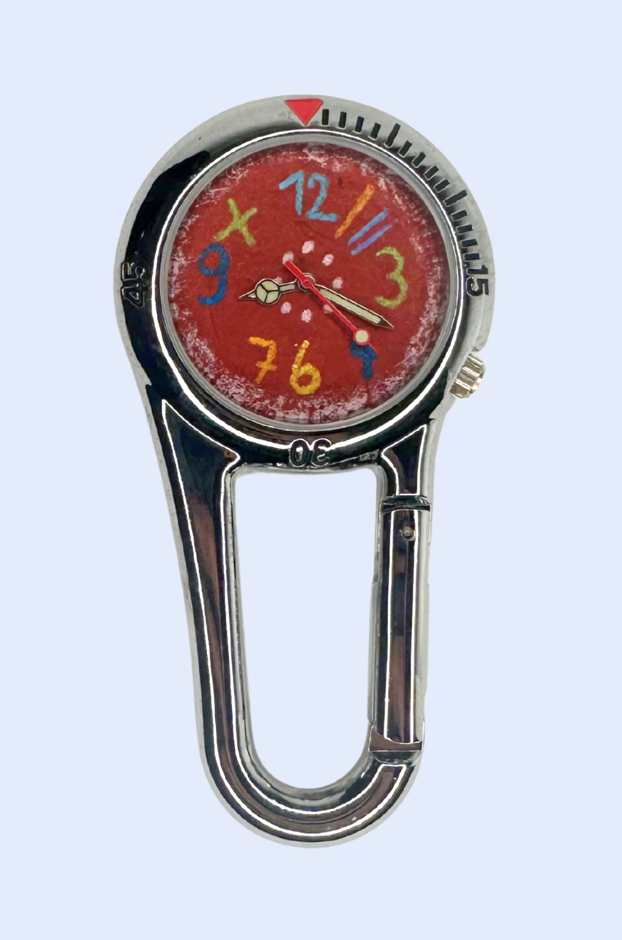 A silver carabiner with an integrated watch that prioritizes design over function. The silver finish reflects a clean, contemporary aesthetic — reduced to the essentials, yet visually distinctive.