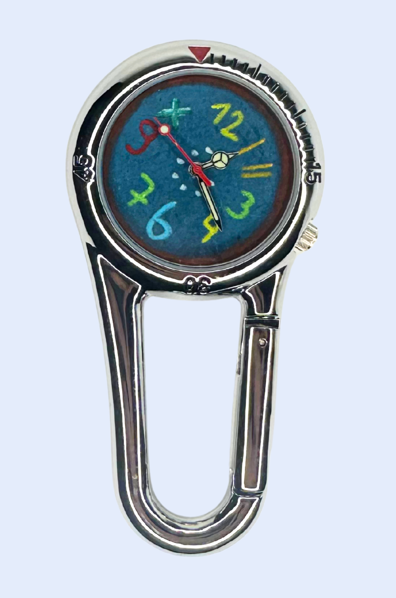A silver carabiner with an integrated watch that prioritizes design over function. The silver finish reflects a clean, contemporary aesthetic — reduced to the essentials, yet visually distinctive.